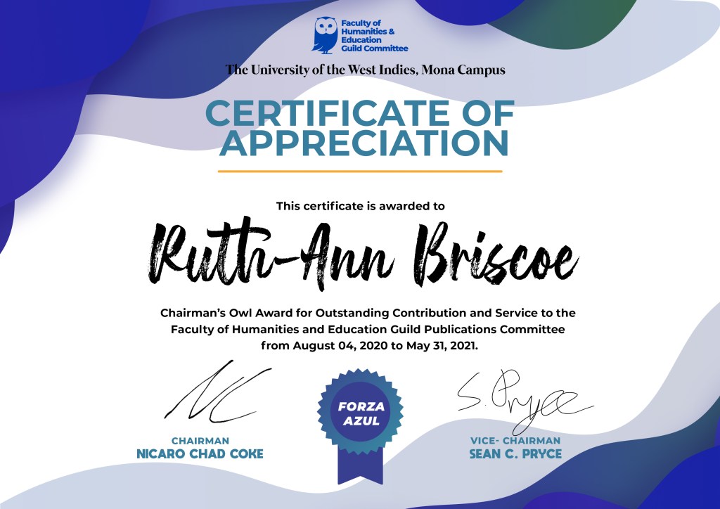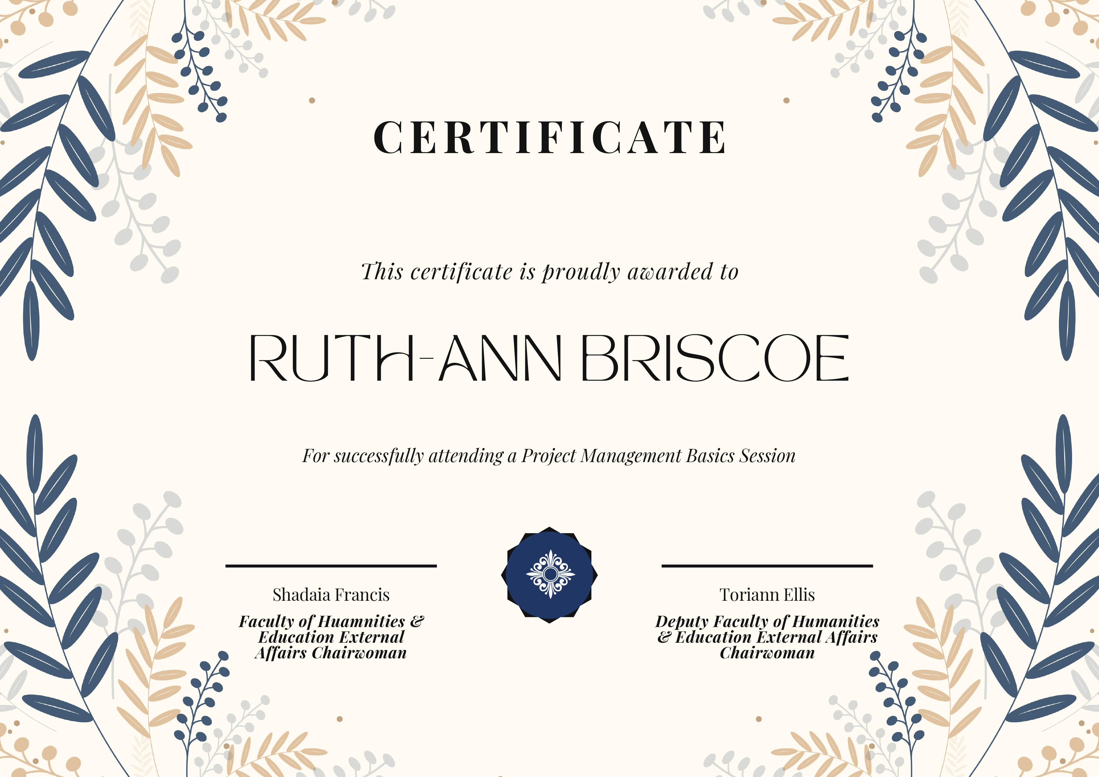 All certificates were rewarded to Ruth-Ann Briscoe from the respective organisations.